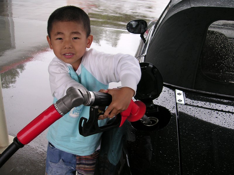 軽井沢に到着、明日に備えて長男がガソリンを給油。