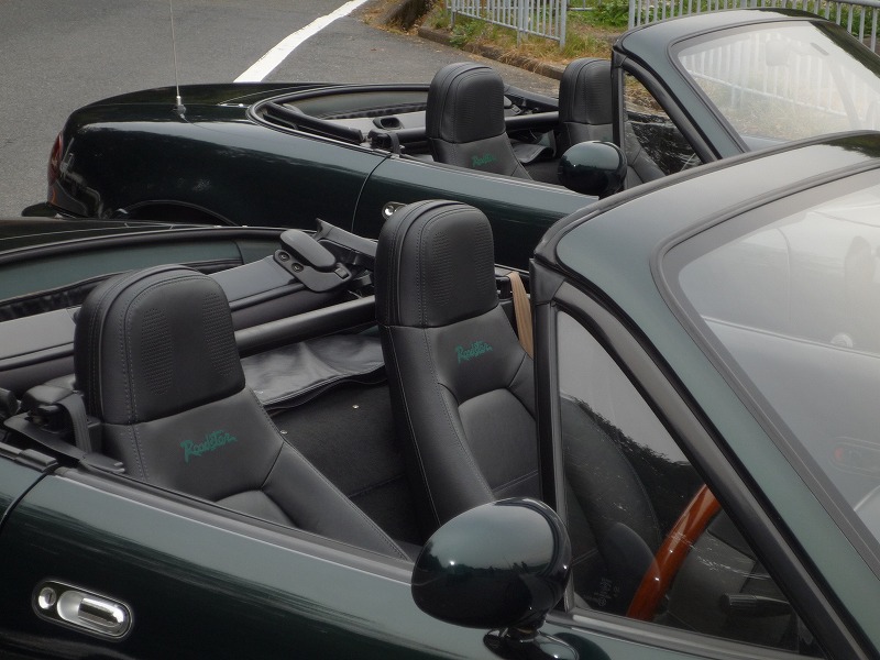 秋の生駒に黒い本皮シートと緑の「Roadster」の刺繍が並ぶ。