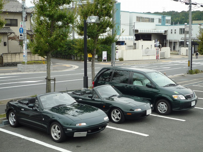 VR-B2台+MPV。マツダのグリーンマイカが3台並ぶ。(MPVはグレースグリーンマイカ)