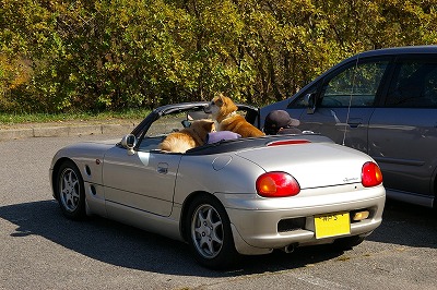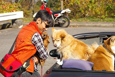 運転手+犬2頭で3人乗り?のカプチーノ。Azimechさんは愛犬とともにすぐにお友達?